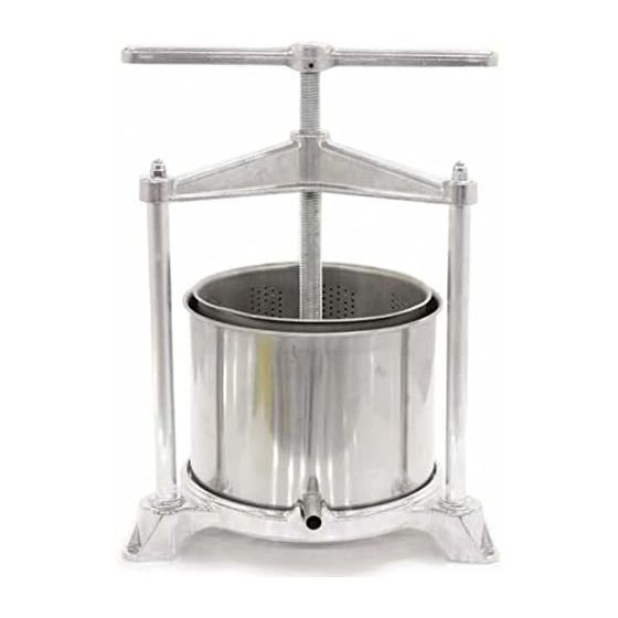 Il corpo del torchietto è realizzato in alluminio pressofuso brillantato per alimenti, mentre il raccoglitore e il contenitore forato sono realizzati in acciaio inox.